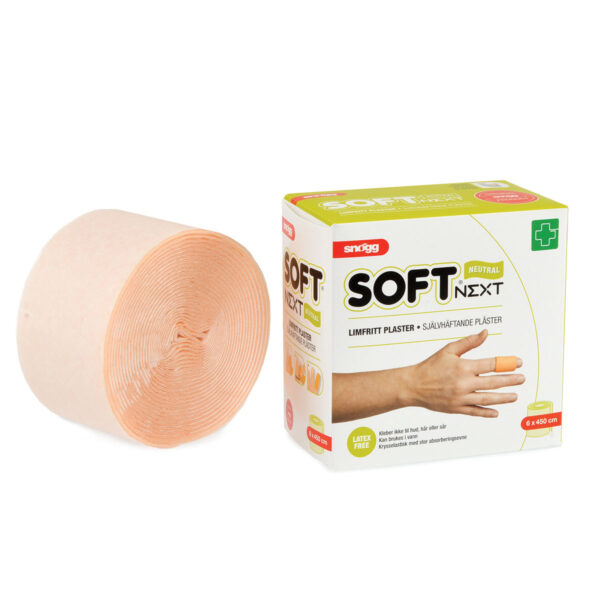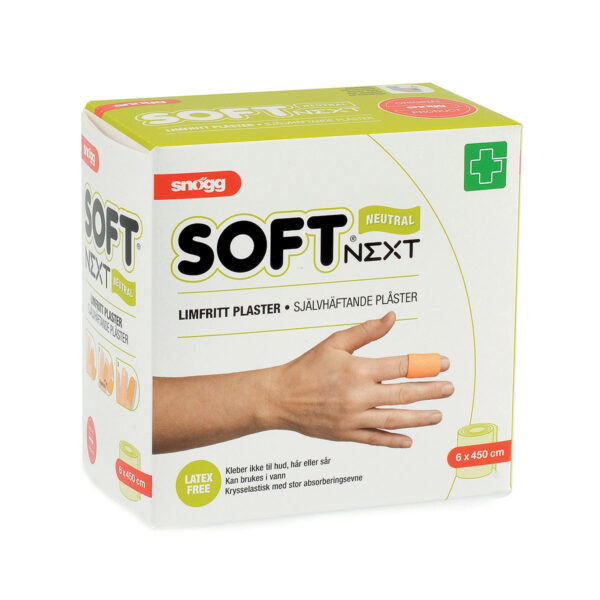 Snøgg Soft NEXT er et limfritt og selvheftende plaster som er blodabsorberende, hudvennlig og tverrelastisk, noe som gir stor bevegelighet over ledd.